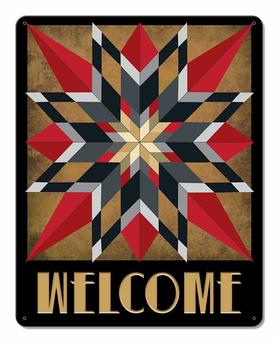 16 POINT STAR TAN QUILT BLOCK PATTERN WELCOME 15" HEAVY DUTY USA MADE METAL SIGN