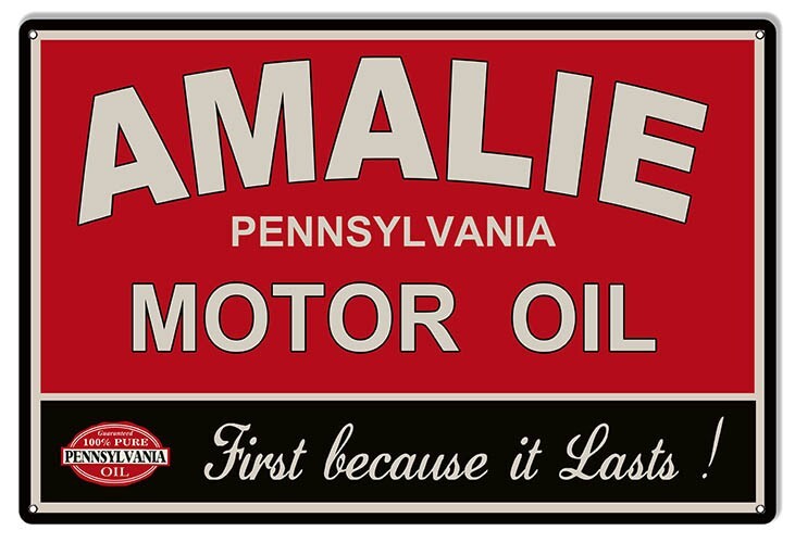 THE SIGN FEATURES A BOLD, VINTAGE ADVERTISEMENT FOR AMALIE PENNSYLVANIA MOTOR OIL.
