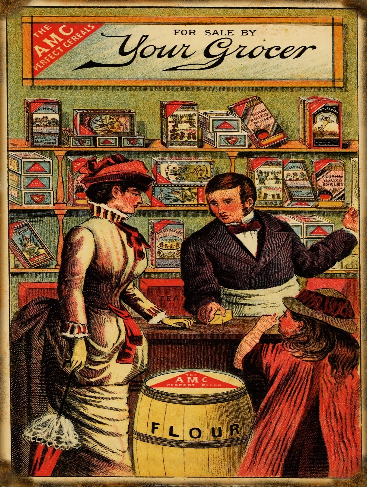 THIS IS AN OLD-FASHIONED ADVERTISEMENT FEATURING A SCENE IN A GROCERY STORE.