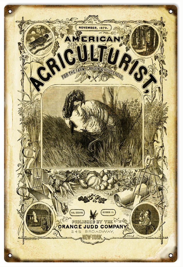 THE SIGN FEATURES A VINTAGE AMERICAN AGRICULTURIST MAGAZINE COVER FROM NOVEMBER 1879.