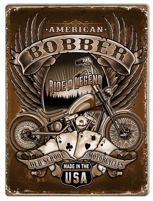 THE SIGN FEATURES A VINTAGE-INSPIRED, MOTORCYCLE-THEMED DESIGN WITH THE BOLD TEXT "AMERICAN BOBBER" AT THE TOP IN LARGE, STYLIZED LETTERS.