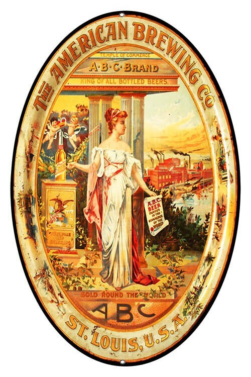 THE SIGN FEATURES AN ELEGANT, VINTAGE ADVERTISEMENT FOR THE AMERICAN BREWING CO. AT THE TOP, WITH THE TEXT "A-B-C BRAND" AND THE TAGLINE "KING OF ALL BOTTLED BEERS" BELOW IT.