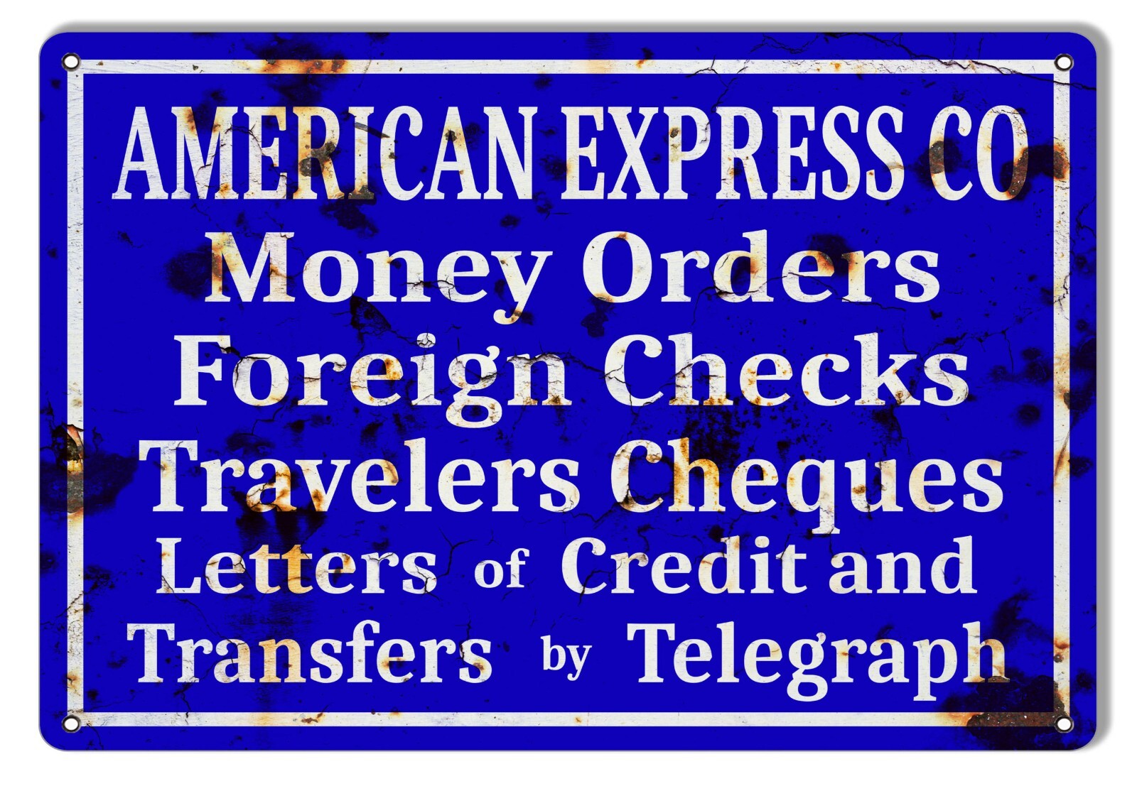 THIS AMERICAN EXPRESS CO. METAL SIGN FEATURES BOLD WHITE TEXT ON A BLUE BACKGROUND, READING "AMERICAN EXPRESS CO" AT THE TOP, FOLLOWED BY A LIST OF SERVICES PROVIDED: