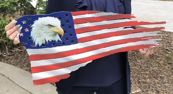 THIS AMERICAN FLAG METAL SIGN FEATURES A DETAILED DESIGN WITH AN EAGLE HEAD ON THE BLUE FIELD.