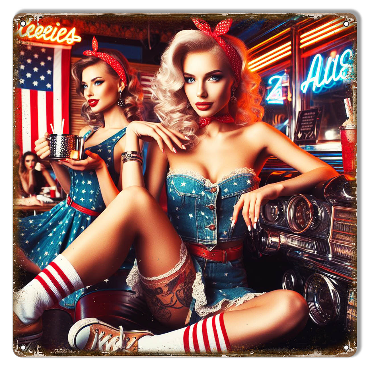 THIS VIBRANT METAL SIGN FEATURES A BOLD AND NOSTALGIC AMERICANA PIN-UP DINER SCENE.