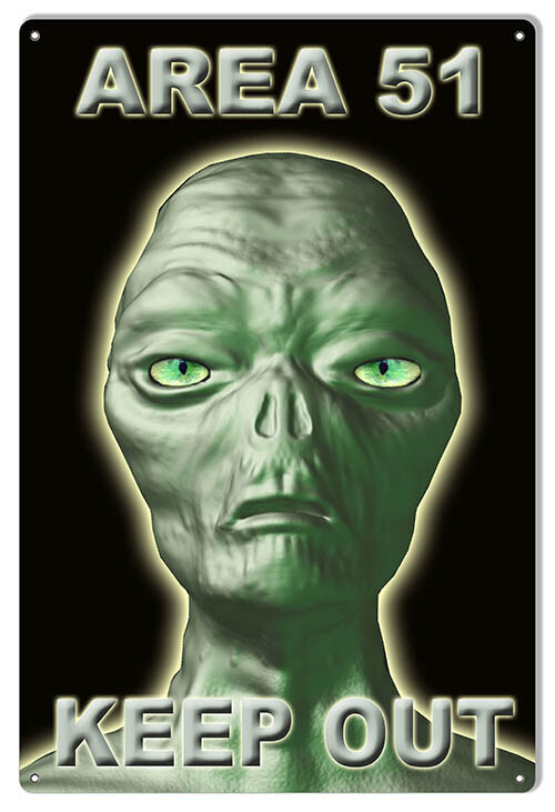 THE IMAGE FEATURES A NOVELTY SIGN THEMED AROUND AREA 51, KNOWN FOR ITS ASSOCIATION WITH ALIEN CONSPIRACY THEORIES.