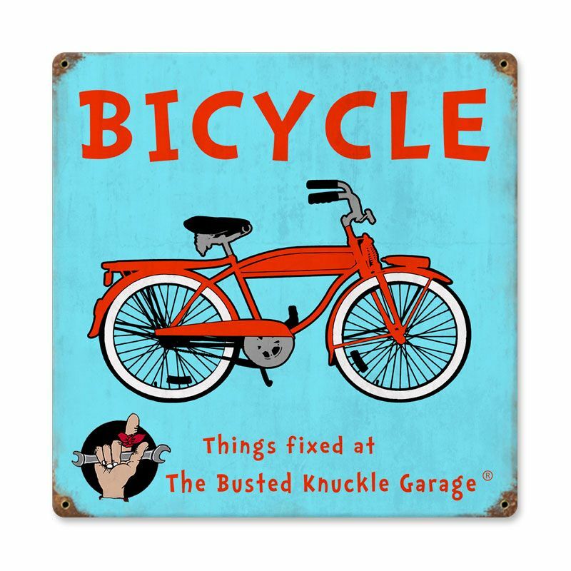 SIGN SHOWS A BRIGHT RED OLD TIMEY STYLE BICYCLE AND THE BUSTED KNUCKLE LOGO IS IN THE BOTTOM LEFT CORNER