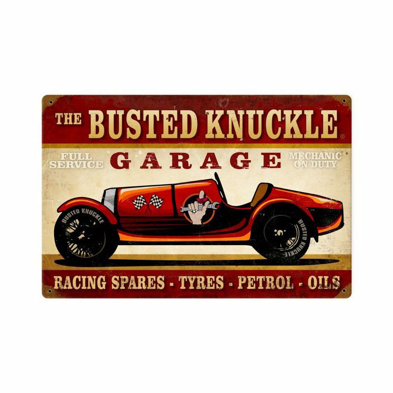 NICE IMAGE OF AN OLD STYLE RACE CAR AND I BELIEVE THIS SIGN IS A BRITISH STYLE SIGN BECAUSE OF THE WAY TIRES IS SPELLED AND THEM SAYING PETROL INSTEAD OF GAS OR GASOLINE