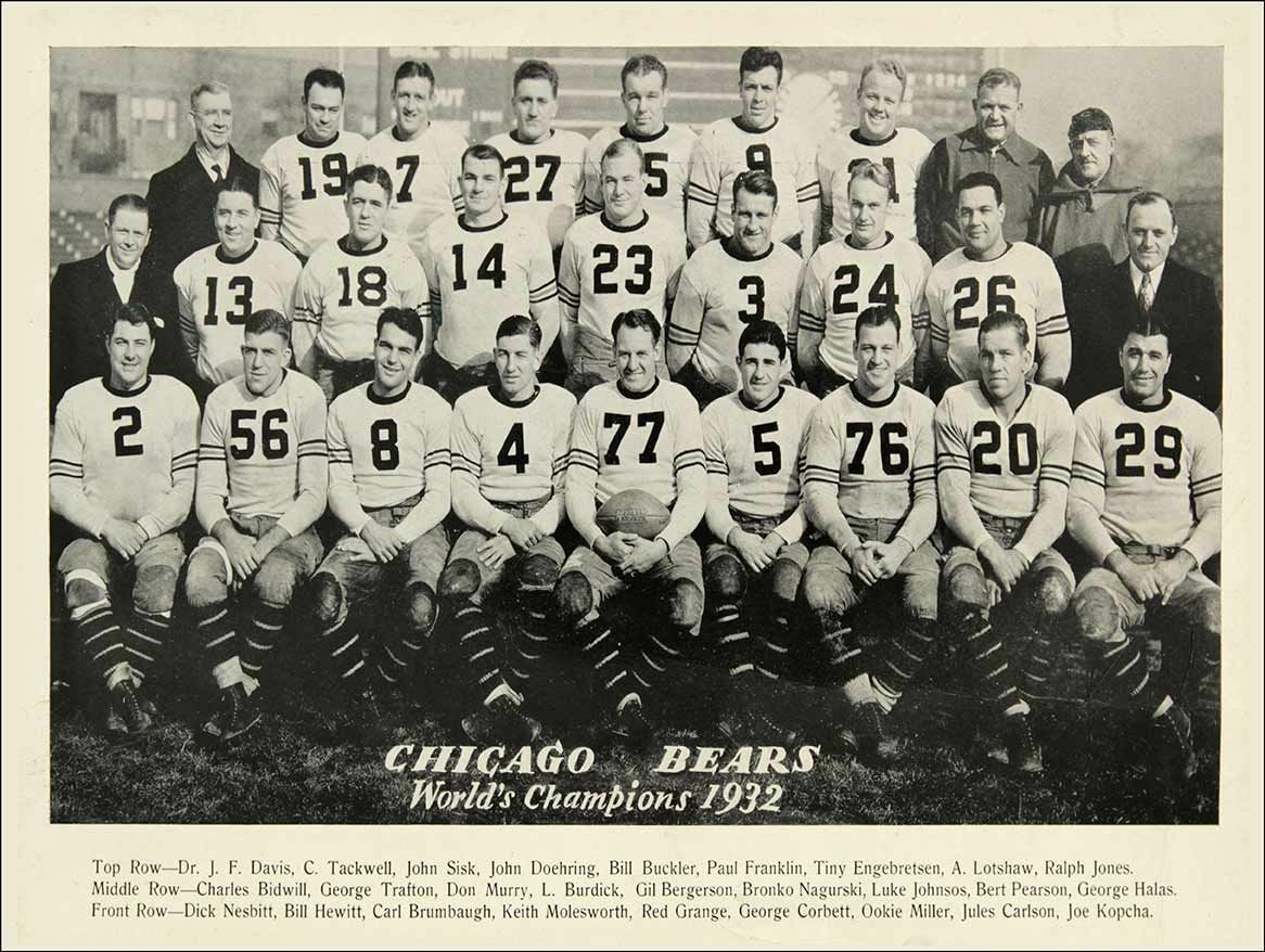MIDDLE ROW: CHARLES BIDWELL, GEORGE TRAFTON, DON MURRY, L. BURDICK, GIL BERGERSON, BRONKO NAGURSKI, LUKE JOHNSOS, BERT PEARSON, GEORGE HALAS