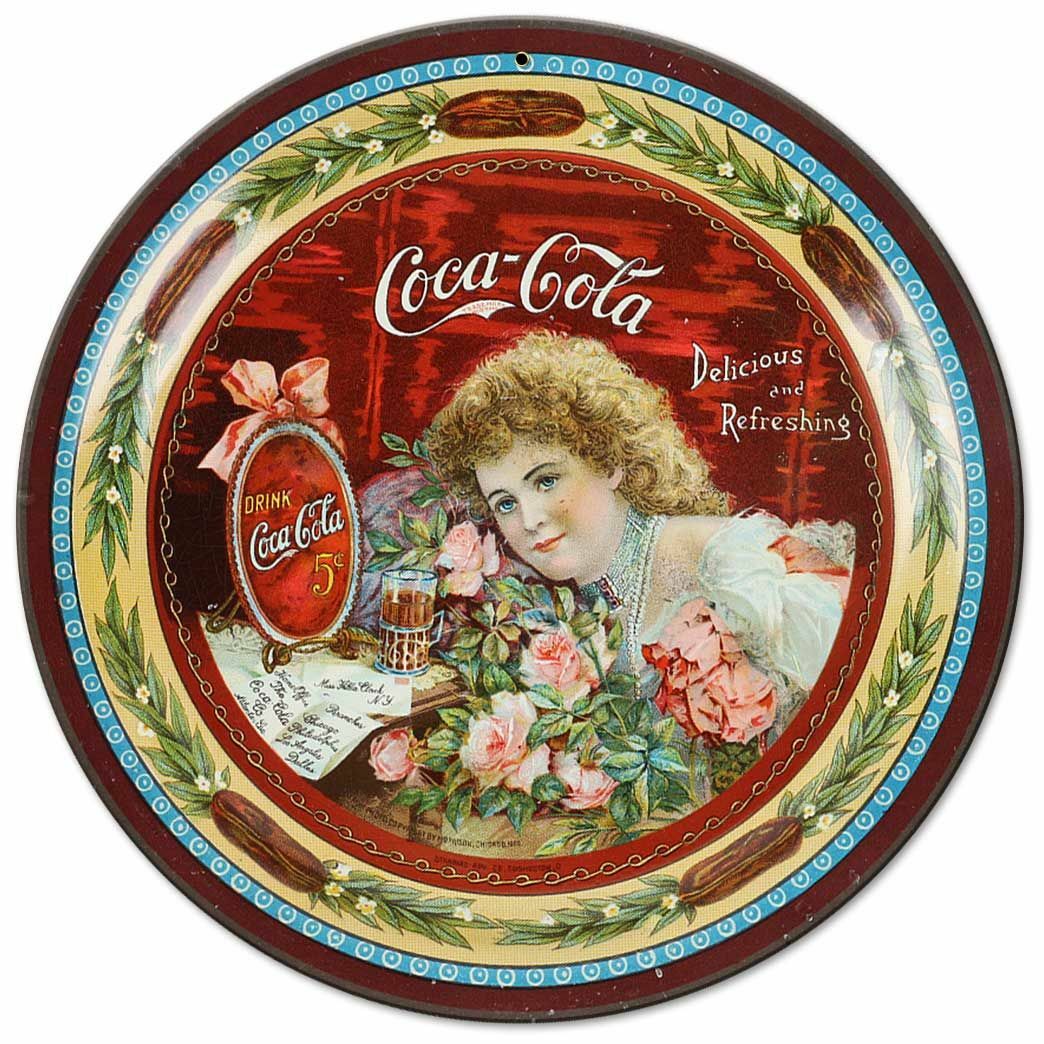 BEAUTIFUL WOMAN LEANING OVER A BOUQUET OF FULL BLOOMED PINK ROSES WITH A GLASS OF COCA-COLA SITTING ON THE DESK WITH A PILE OF LETTERS AND A SIGN ON A EASEL THAT SAYS DRINK COCA-COLA 5¢ ON IT THAT HAS A BRIGHT PINK BOW TIED TO THE TOP OF IT