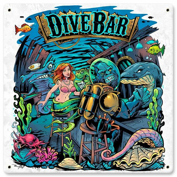 UNDERWATER OCEAN SCENE WITH A MERMAID, TURTLE, SHARK AND OTHER SEA CREATURES SITTING A BAR UNDER THE WATER