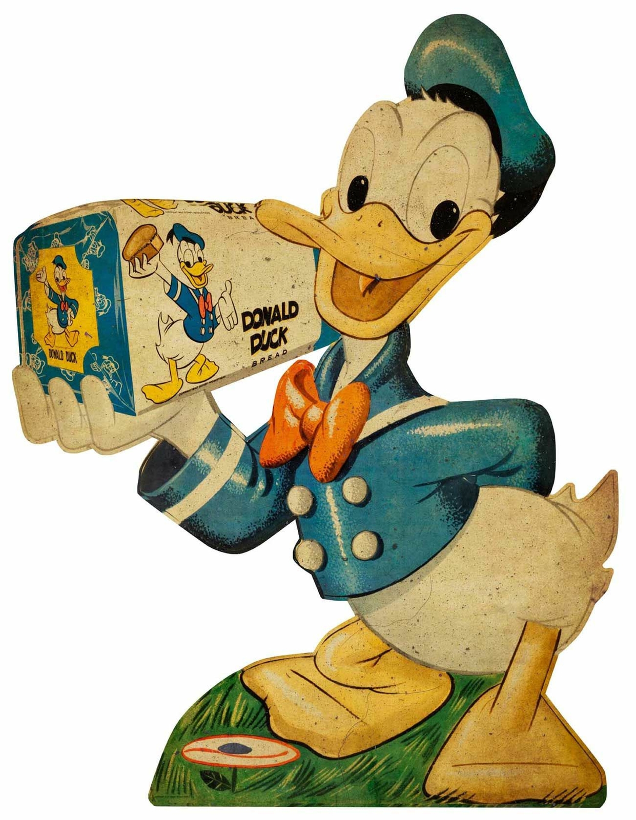 DONALD DUCK, ONE OF WALT DISNEY'S MOST FAMOUS CHARACTERS, HOLDING UP A PACK OF BREAD BEARING HIS NAME AND IMAGE